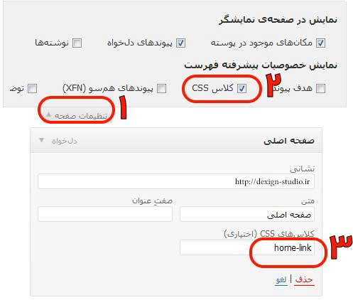 بعد از انجام این کار گزینه صفحه اصلی را انتخاب کرده و در کادر تنظیمات آن در قسمت جدید با نام کلاسهای CSS عبارت home-link را وارد کنید.