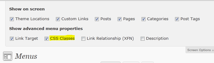 3. فعال سازی کلاس CSS در بخش فهرستهای وردپرس : مرحله دومی که برای این کار باید انجام دهیم این است که با فعال سازی گزینه کلاس CSS در بخش فهرست ها پیشخوان وردپرس بتونیم برای هر کدام از گزینه های منو سایت وردپرسی خود یک کلاس CSS خاص را مشخص کنیم و از این طریق بتونیم به هر کدام از آن ها ظاهر و آیکون ویژه ای را بدهیم. برای این کار پس از رفتن به پیشخوان سایت وردپرس خود از بخش فهرست ها در منو نمایش می توانید در بالای صفحه با کلیک بر روی دکمه “تنظیمات صفحه” و تیک دار کردن ” گزینه CSS ” به تمامی گزینه ها در بخش فهرست ها یک خصوصیت جدید با نام کلاسهای CSS اضافه کنید.