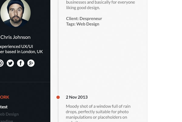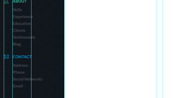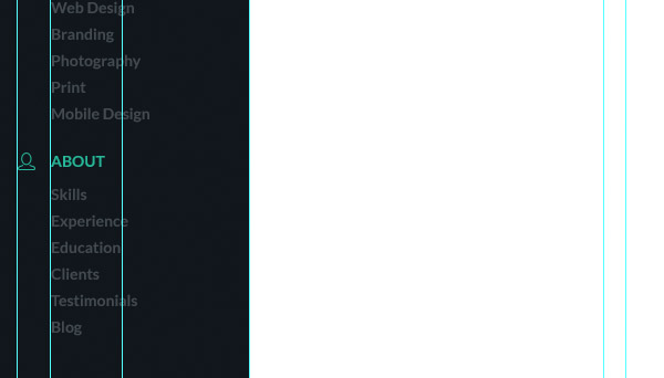 در این قسمت می خواهیم منوی اصلی را بسازیم. یک Group به نام Navigation ایجاد کنید و از Free Vector دانلود شده آیکن Document را انتخاب کرده و در Navigation Group قرار می دهیم با استفاده از Ctrl+T اندازه سایز آیکن را به 13px در 16px تغییر می دهیم و نام لایه را نیز به Work icon تغییر می دهیم.رنگ آنرا روی #d35136 قرار میدهیم آیکن را 40px پایینتر از خط کشیده شده و چسبیده به خط راهنمای عمودی اول می گذاریم