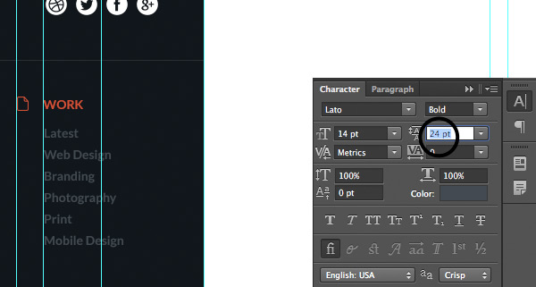 رنگ Foreground را به ffffff# تغییر دهید و ابزار Lie tool را انتخاب کرده سپس یک خط 50px زیر آیکن های شبکه های اجتماعی و با ضخامت 1px در Left sidebar به صورت افقی بکشید.