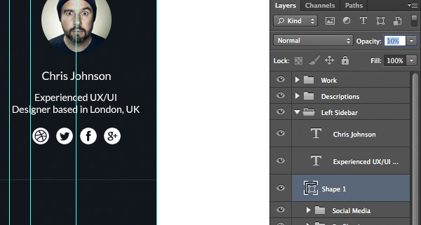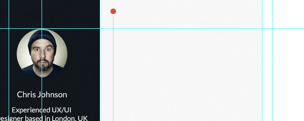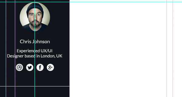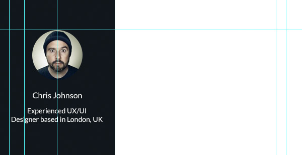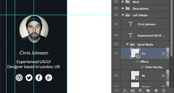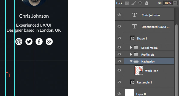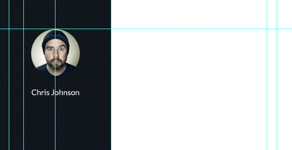حال یک Title Group بسازید و ابزار Horizontal Type tool را انتخاب کرده و با رنگ ffffff# و سایز فونت 16pt نام پروفایل خود را بنویسید ما در اینجا از نام Chris Johnson استفاده کردیم. و آنرا درست 25px پایین تر از عکس آواتار و درست در وسط خط راهنمای سوم عمودی قرار دهید