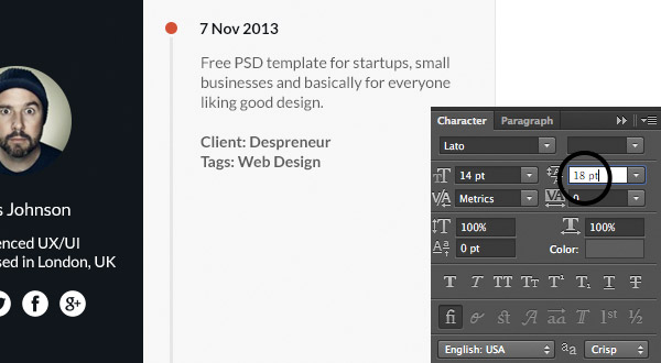 رنگ Foreground را به 5e5e5e تغییر می دهیم و در زیر تاریخ توضیحاتی در مورد کارهایی که در آن تاریخ انجام داده ایم می دهیم و سپس دکمه اینتر را دو بار کلیک کرده و متن Client و Tags را می نویسیم.متن اولی را از فونت Lato و در حالت regular و سایط 14pt و متن Client و Tags را در حالت Boldمی نویسیم.Line height را روی 18pt تنظیم می کنیم