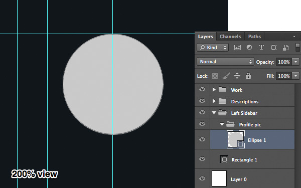 یک Group در Left Sidebar Group بسازید و نام آنرا Profile Pic بگذارید داخل آن با استفاده از ابزار Ellipse tool و نگه داشتن دکمه Shift یک دایره 100px در 100px درست زیر خط راهنمای افقی و وسط خط راهنمای سوم عمودی بکشید