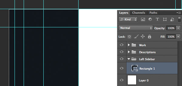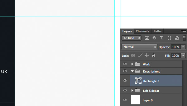 در Description Group رنگ Foreground را به #f7f7f7 تغییر می دهیم و مستطیلی با ابعاد 320px در 1320px با رنگ Foreground می کشیم درست مابین قسمت Left sidebar و خط راهنمای پنجم عمودی