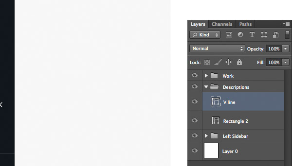رنگ Foreground را به e7e7e8 تغییر دهید و با استفاده از ابزار Line tool خطی به ضخامت 1px و درست روی خط راهنمای عمودی پنجم از بالای صفحه تا پایین صفحه بکشید. این خط جدا کننده بخش Description و Mane می باشد. نام لایه خط را V line بگذارید.